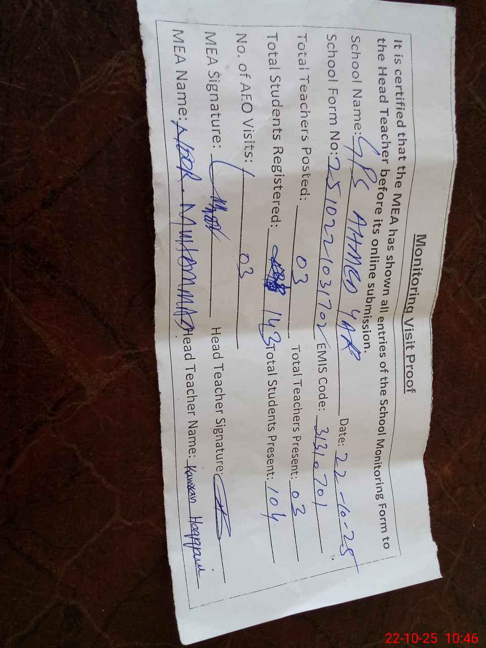 | Attendance Register | Head Teacher | MEA with School | Visit Proof |