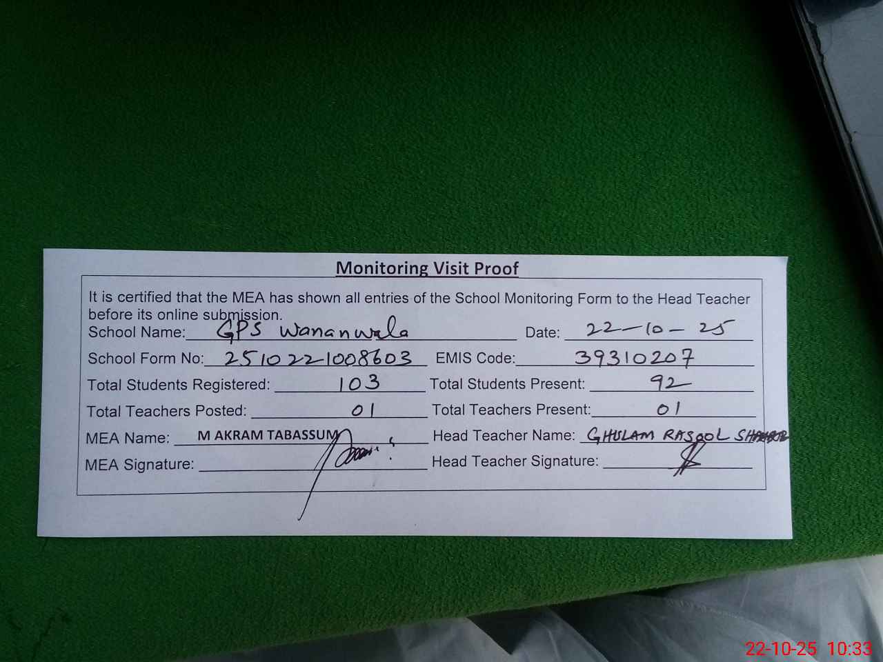 | EMIS Code: 39310207 | Name of School: GPS WANAN WALA | |||