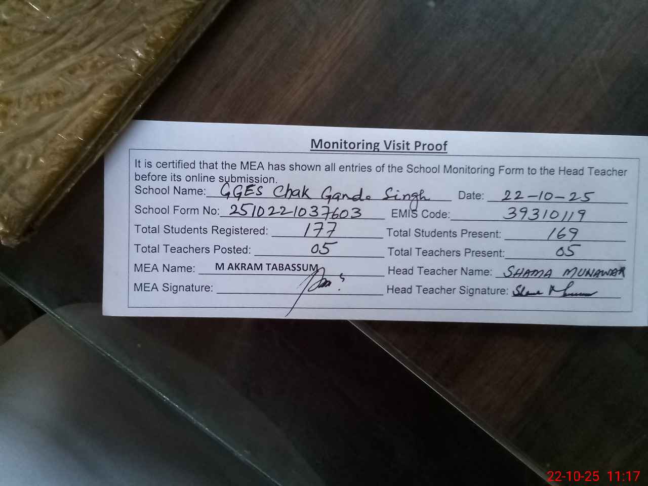 | Attendance Register | Head Teacher | MEA with School | Visit Proof |