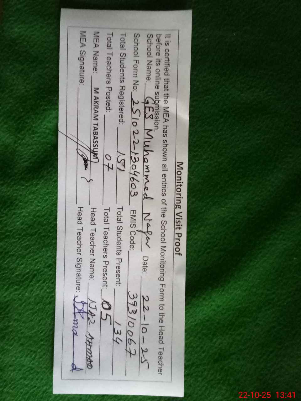 | Attendance Register | Head Teacher | MEA with School | Visit Proof |