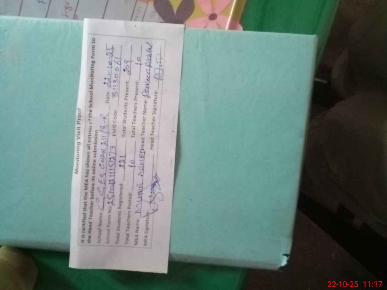 | Attendance Register | Head Teacher | MEA with School | Visit Proof |