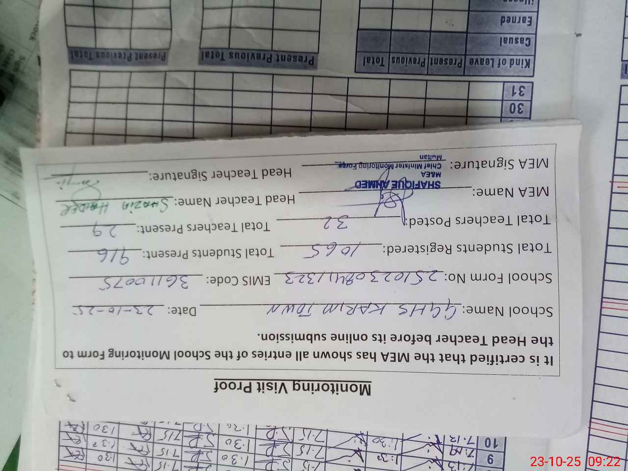 | Attendance Register | Head Teacher | MEA with School | Visit Proof |