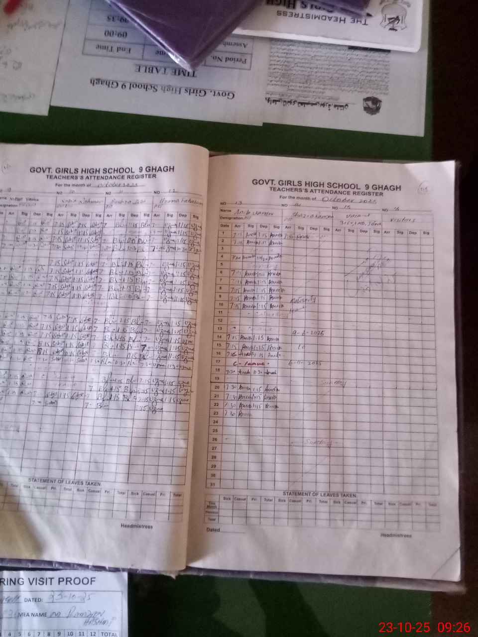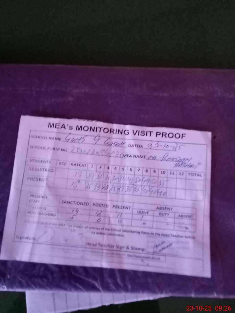 | Attendance Register | Head Teacher | MEA with School | Visit Proof |