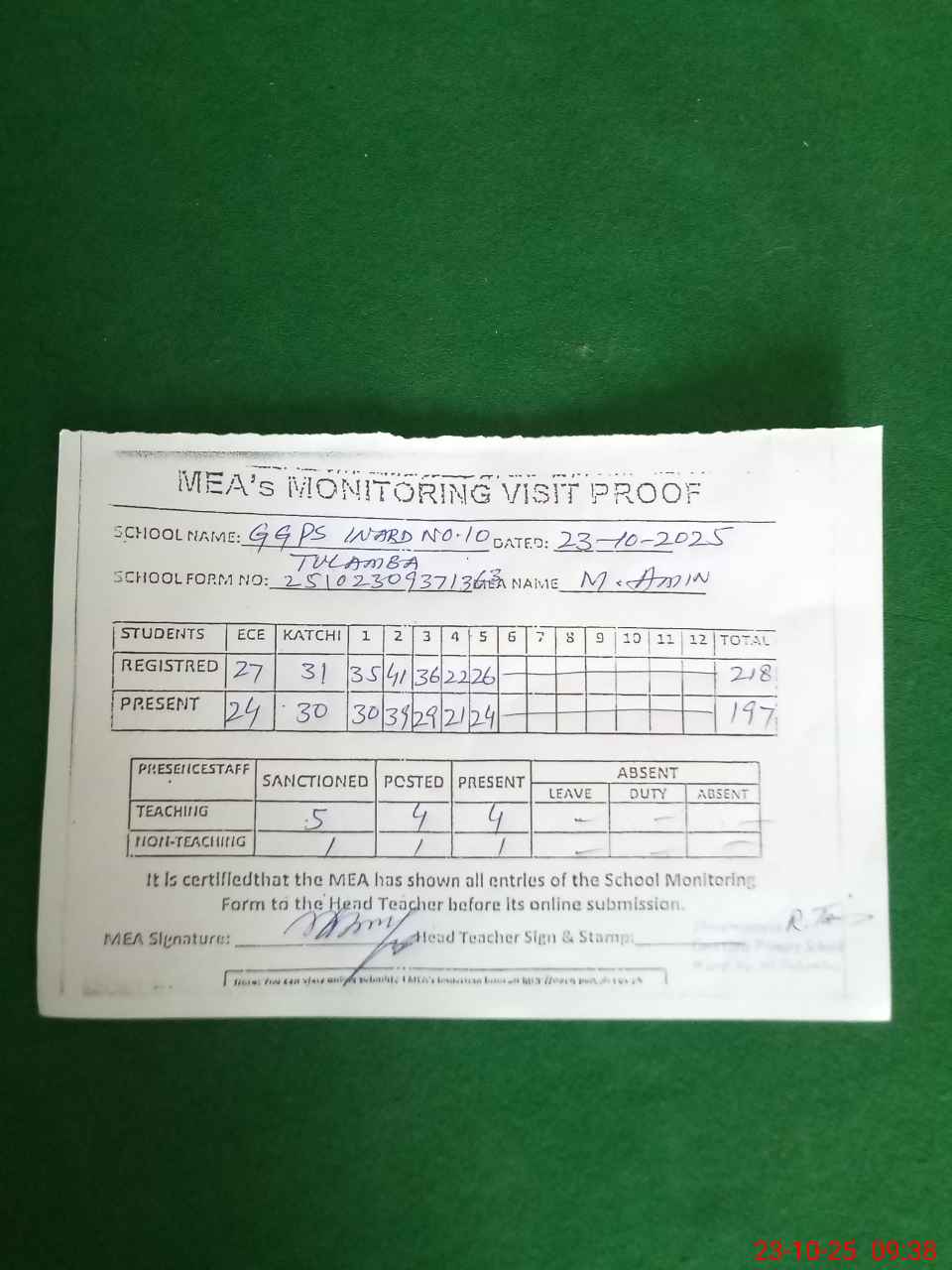 | Attendance Register | Head Teacher | MEA with School | Visit Proof |