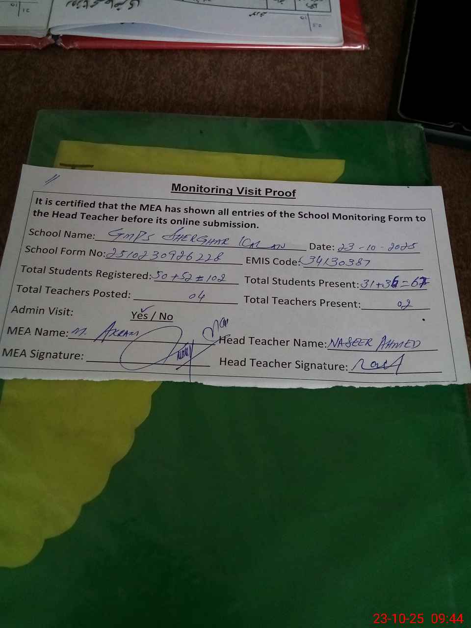 | Attendance Register | Head Teacher | MEA with School | Visit Proof |