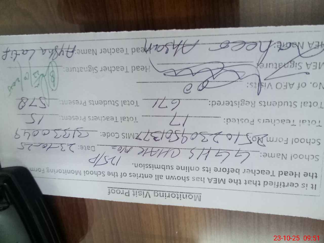 | Monitoring Date: 23-10-2025 | Start Time: 23-10-2025 08:45 AM | End Time: 23-10-2025 09:58 AM | Name of MEA: Za**** Ah**** | |