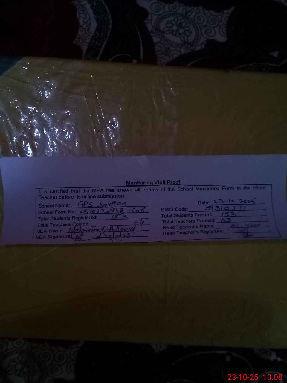 | Attendance Register | Head Teacher | MEA with School | Visit Proof |