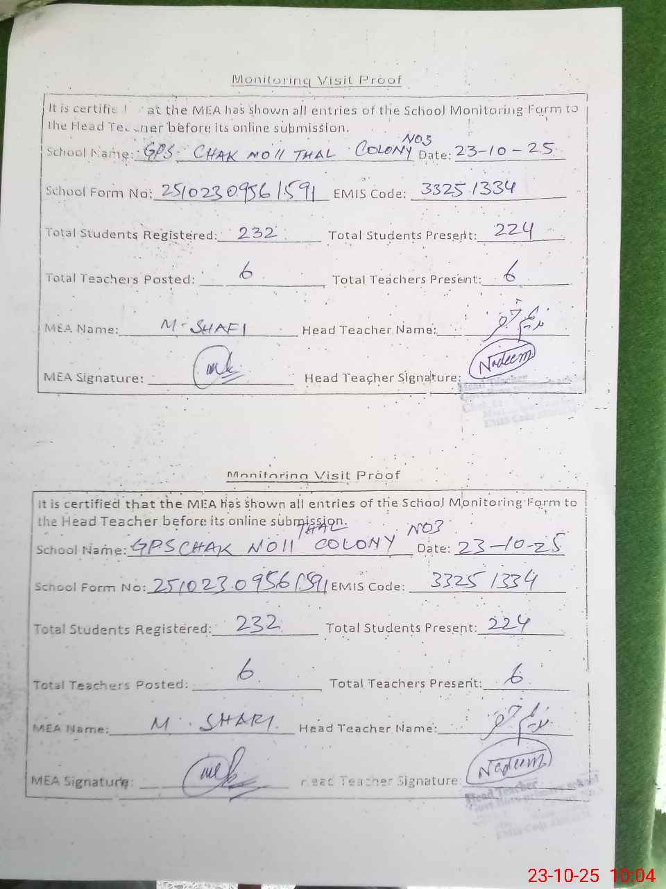 | EMIS Code: 33251334 | Name of School: GPS CHAK 11 THAL COLONY NO 3 | |||