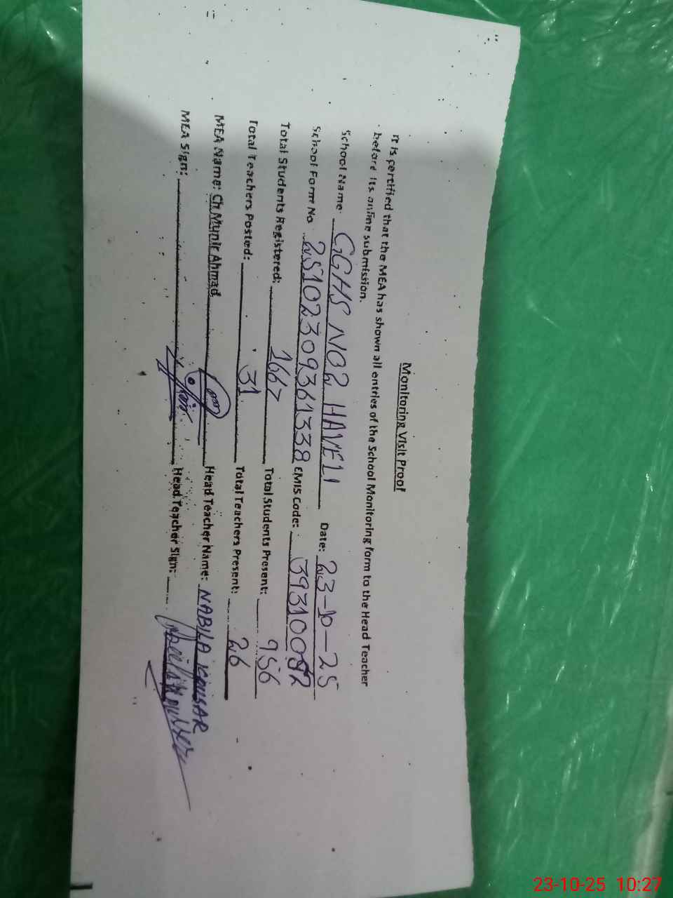 | Attendance Register | Head Teacher | MEA with School | Visit Proof |