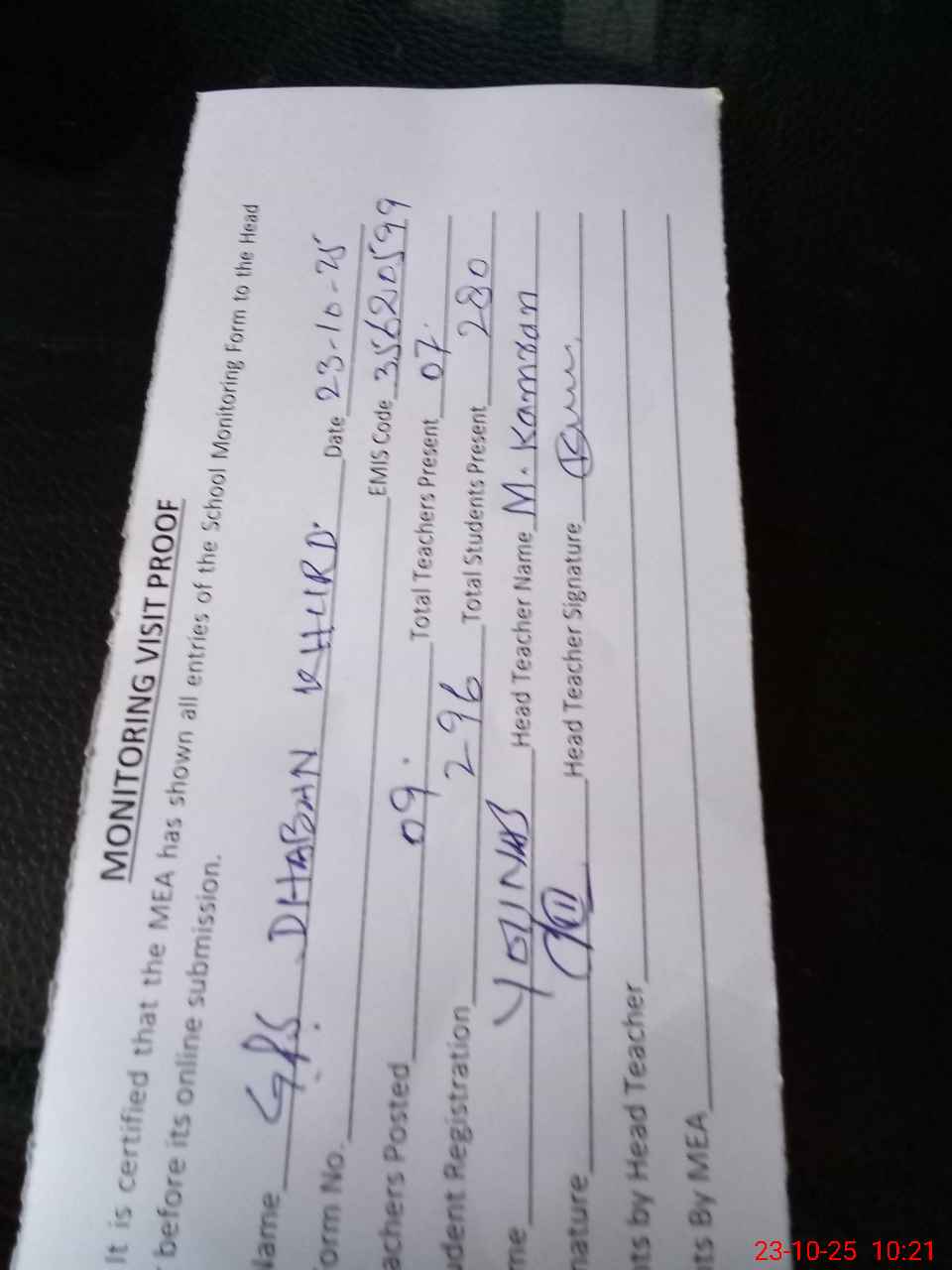 | Attendance Register | Head Teacher | MEA with School | Visit Proof |