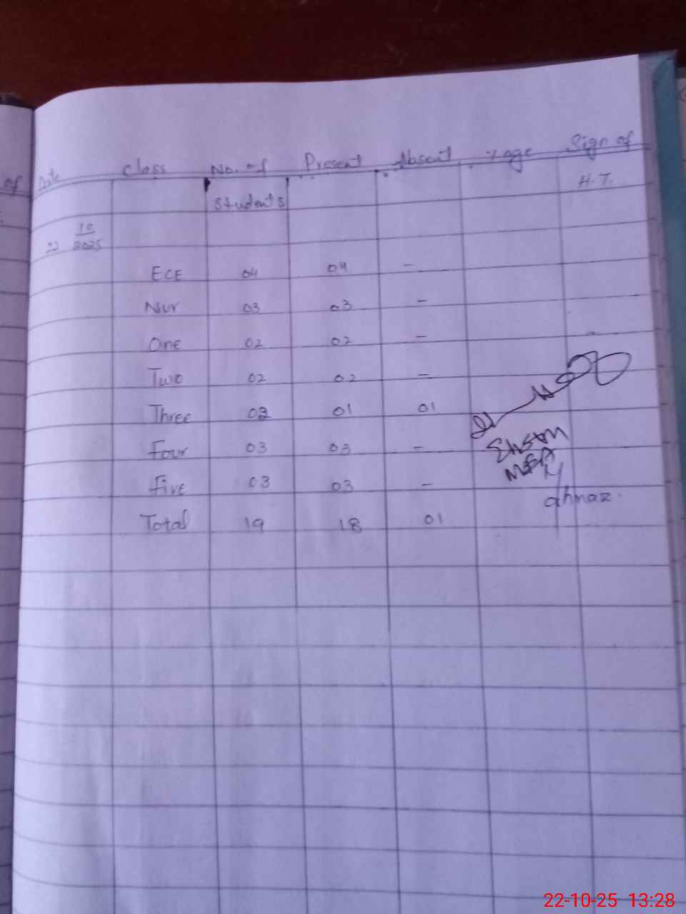 | No. of Students Present - Male | 3 | 0 | 3 | 1 | 0 | 1 | 2 | 3 | 13 | |||||||