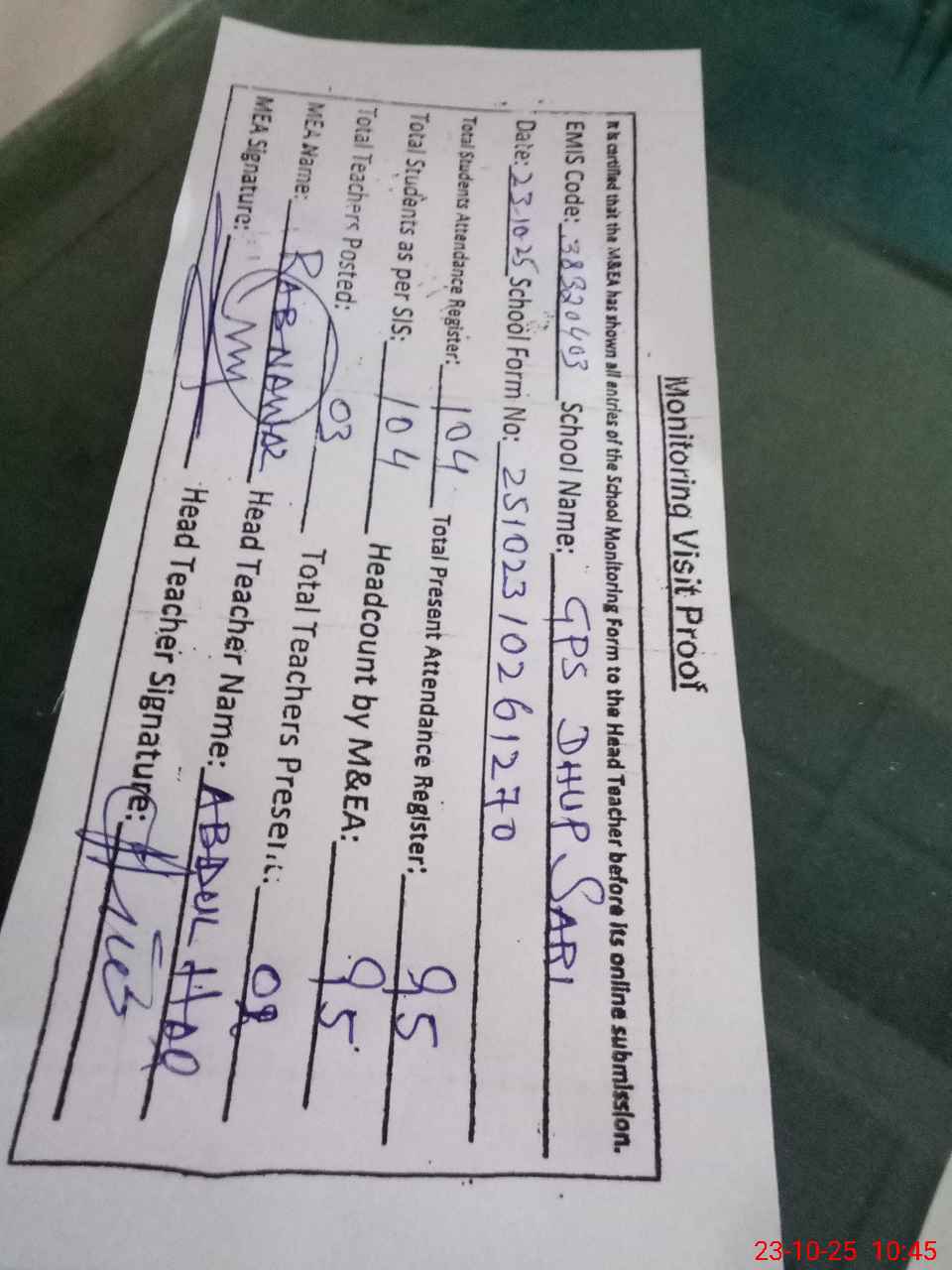 | Attendance Register | Head Teacher | MEA with School | Visit Proof |