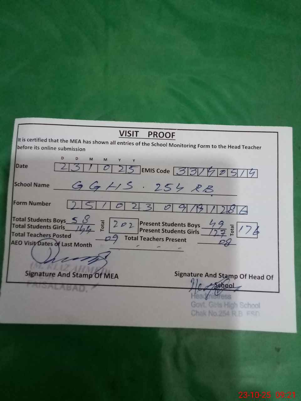 | Attendance Register | Head Teacher | MEA with School | Visit Proof |