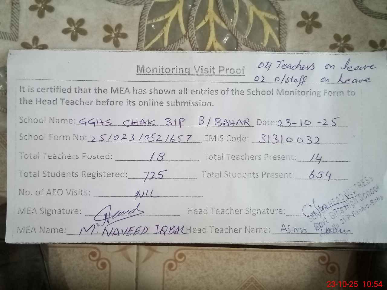 | Attendance Register | Head Teacher | MEA with School | Visit Proof |