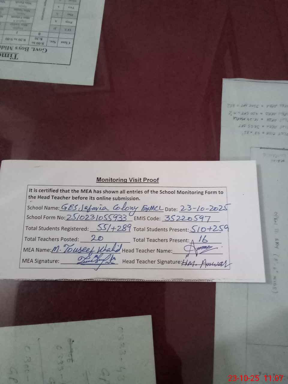 | EMIS Code: 35220597 | Name of School: GES JAFARIA COLONY (EX-MCL) | |||