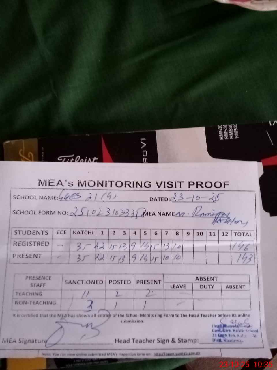 | Certified that this School was Inspected by the Undersigned MEA/DMO Today and the Information Stated Above is as Per Record. | |||||