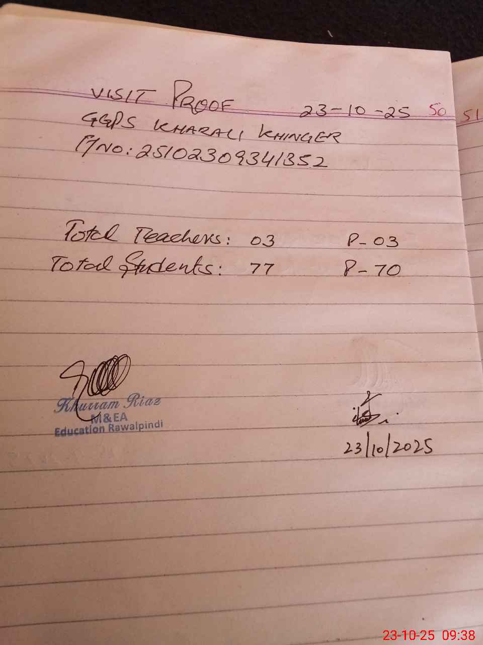 | Monitoring Date: 23-10-2025 | Start Time: 23-10-2025 09:19 AM | End Time: 23-10-2025 09:41 AM | Name of MEA: Kh**** Ri**** | |