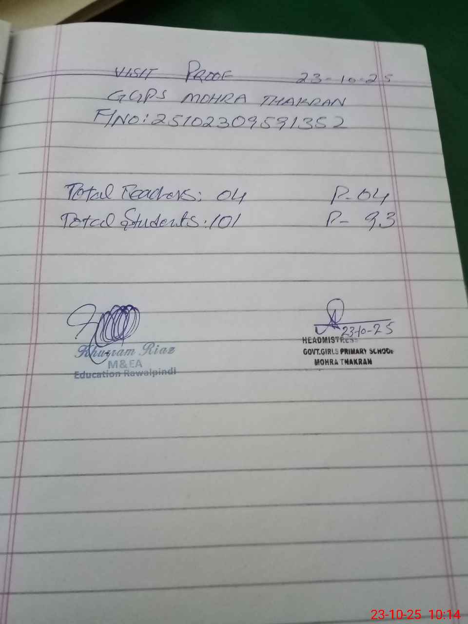 | Attendance Register | Head Teacher | MEA with School | Visit Proof |