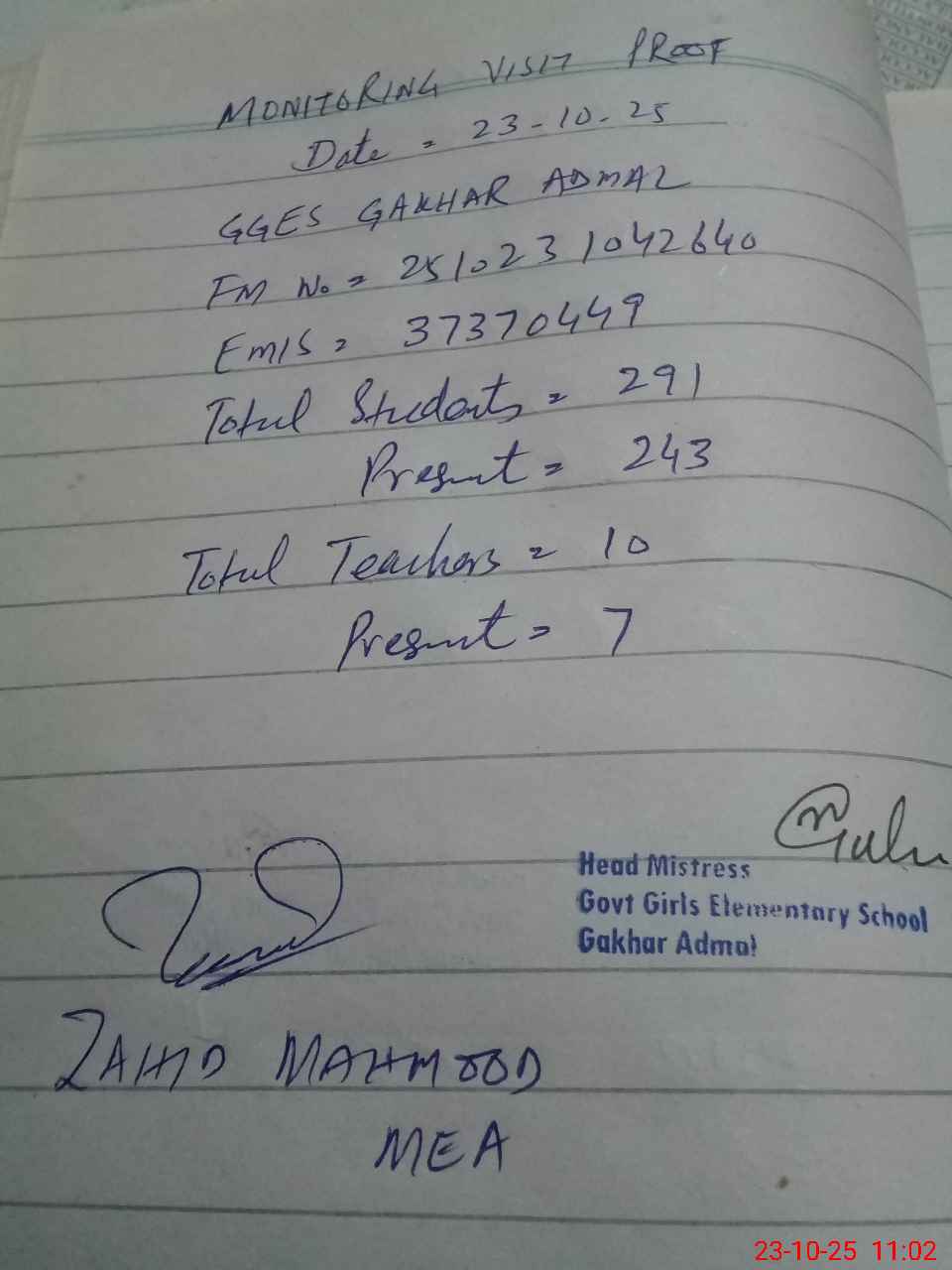 | Attendance Register | Head Teacher | MEA with School | Visit Proof |
