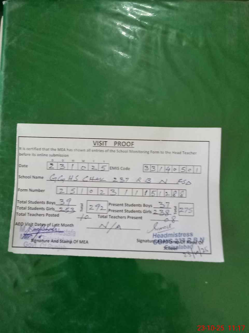 | Attendance Register | Head Teacher | MEA with School | Visit Proof |