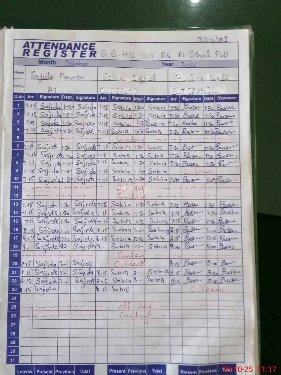 | CNIC | Full Name | Designation | R/C | Absence During Last Calender Month |
