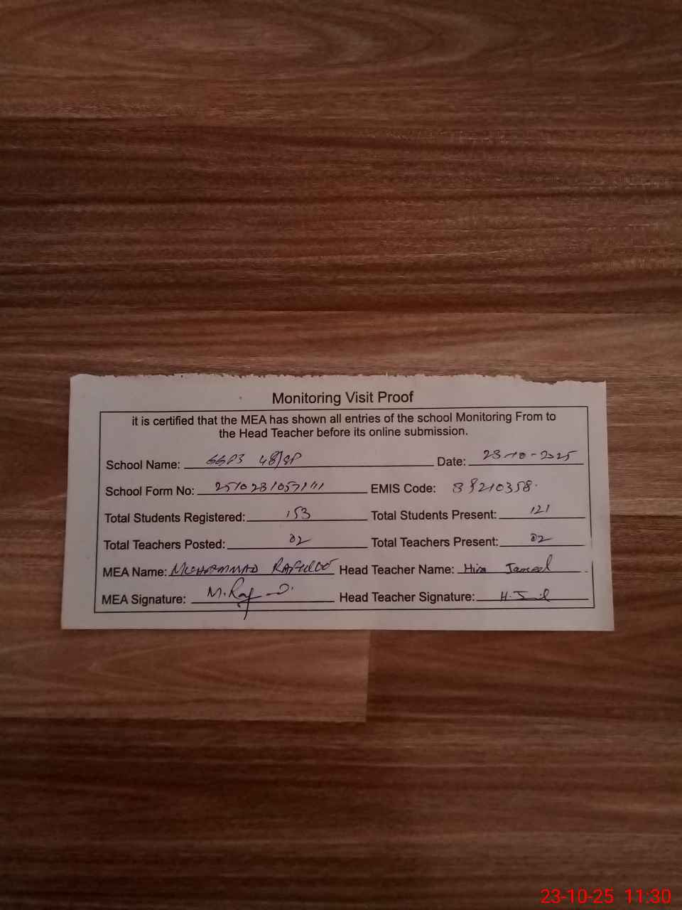 | Attendance Register | Head Teacher | MEA with School | Visit Proof |