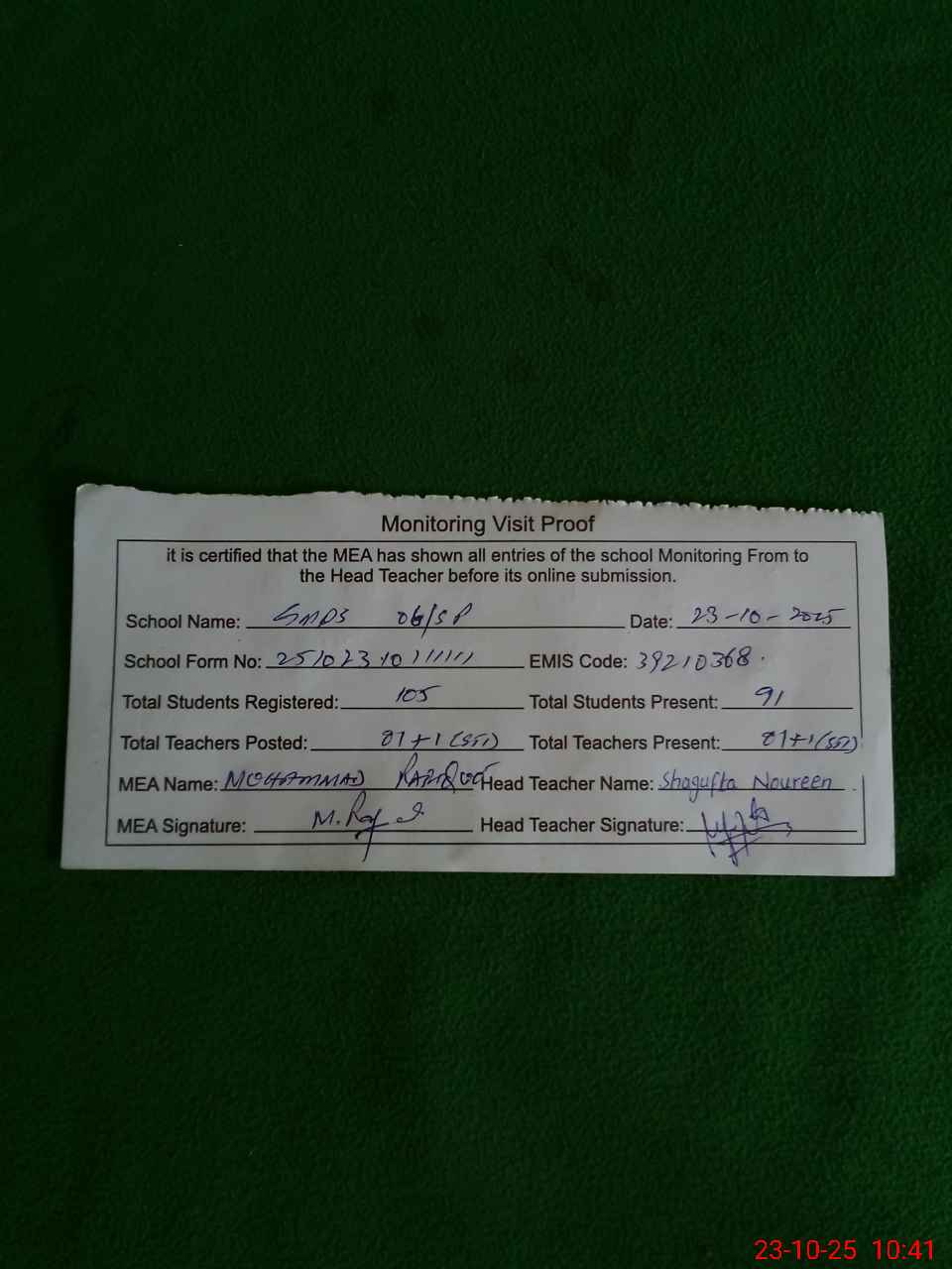 | Certified that this School was Inspected by the Undersigned MEA/DMO Today and the Information Stated Above is as Per Record. | |||||
