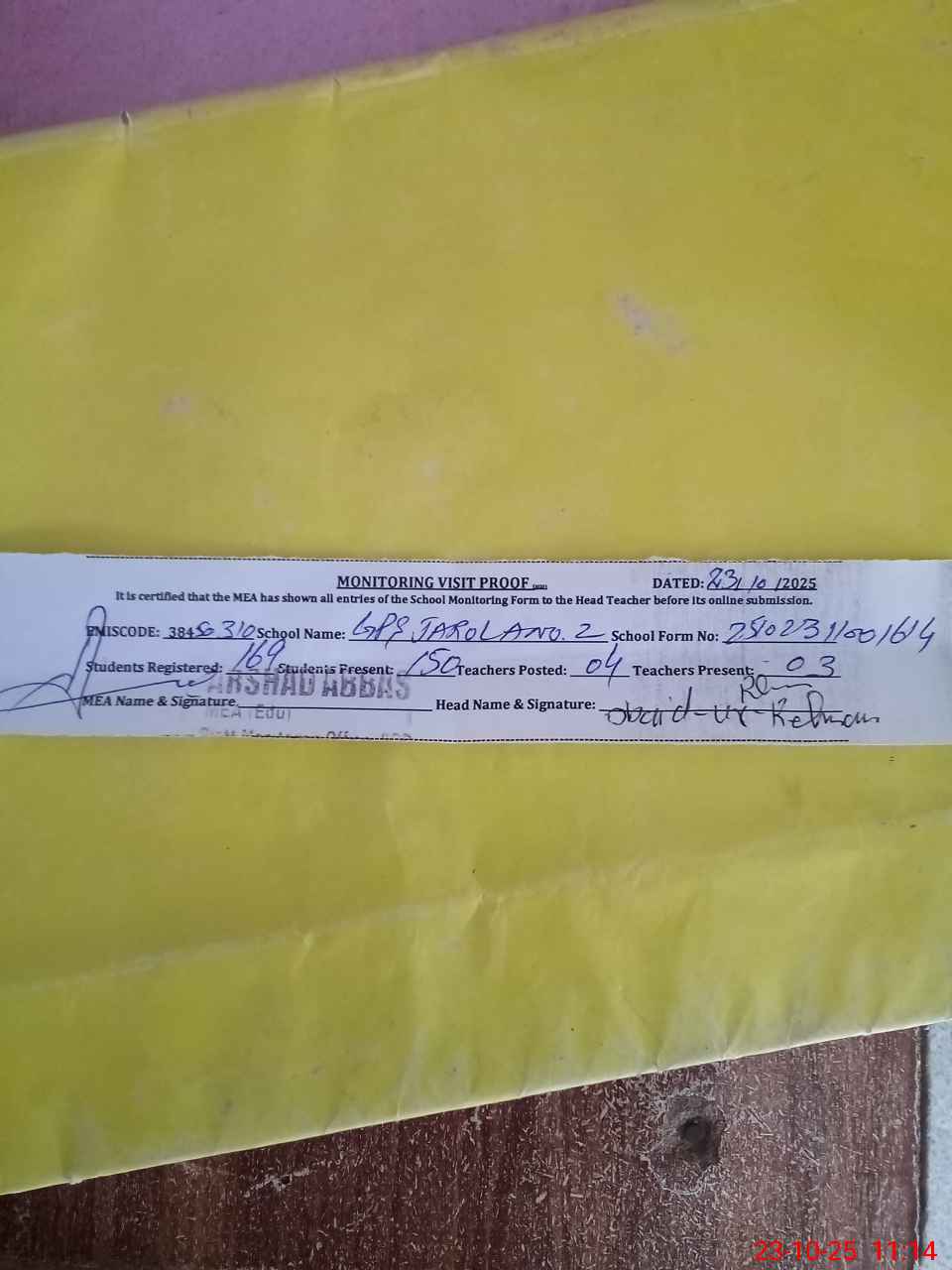 | Attendance Register | Head Teacher | MEA with School | Visit Proof |