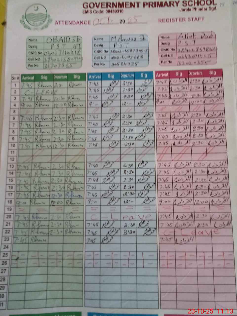 | CNIC | Full Name | Designation | R/C | Absence During Last Calender Month |