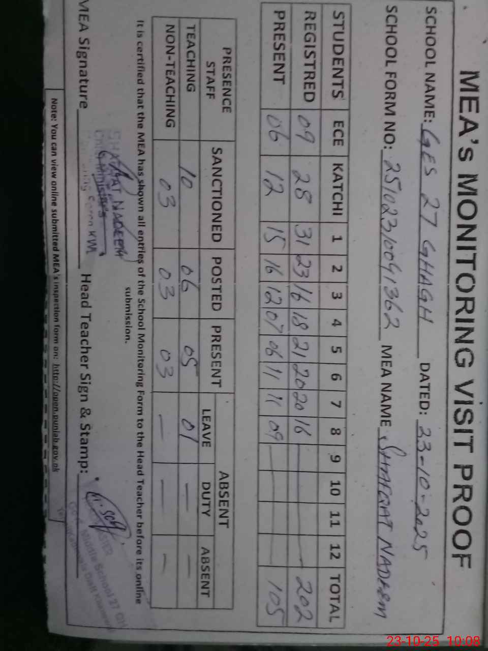 | Attendance Register | Head Teacher | MEA with School | Visit Proof |