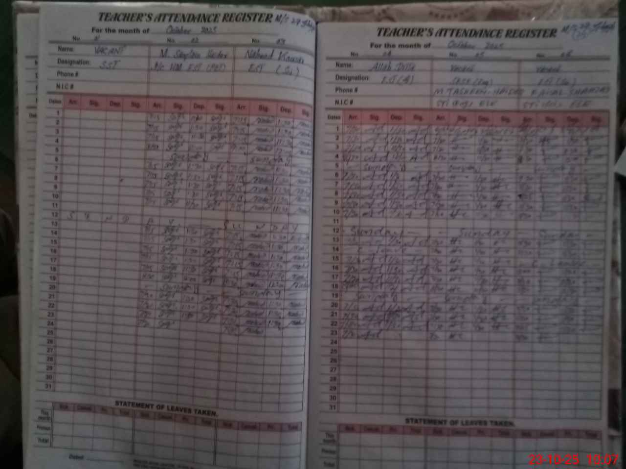 | CNIC | Full Name | Designation | R/C | Absence During Last Calender Month |