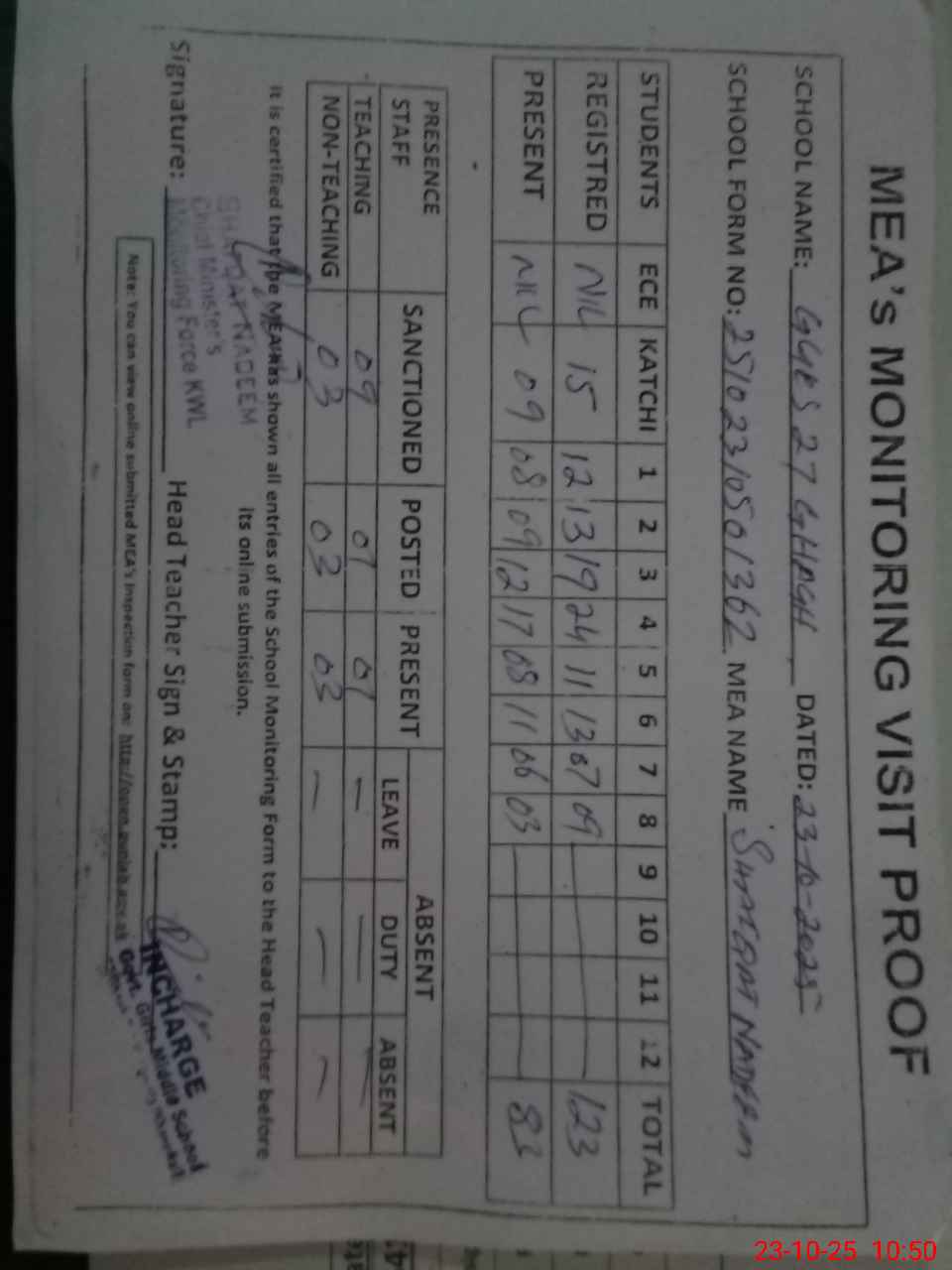| Attendance Register | Head Teacher | MEA with School | Visit Proof |