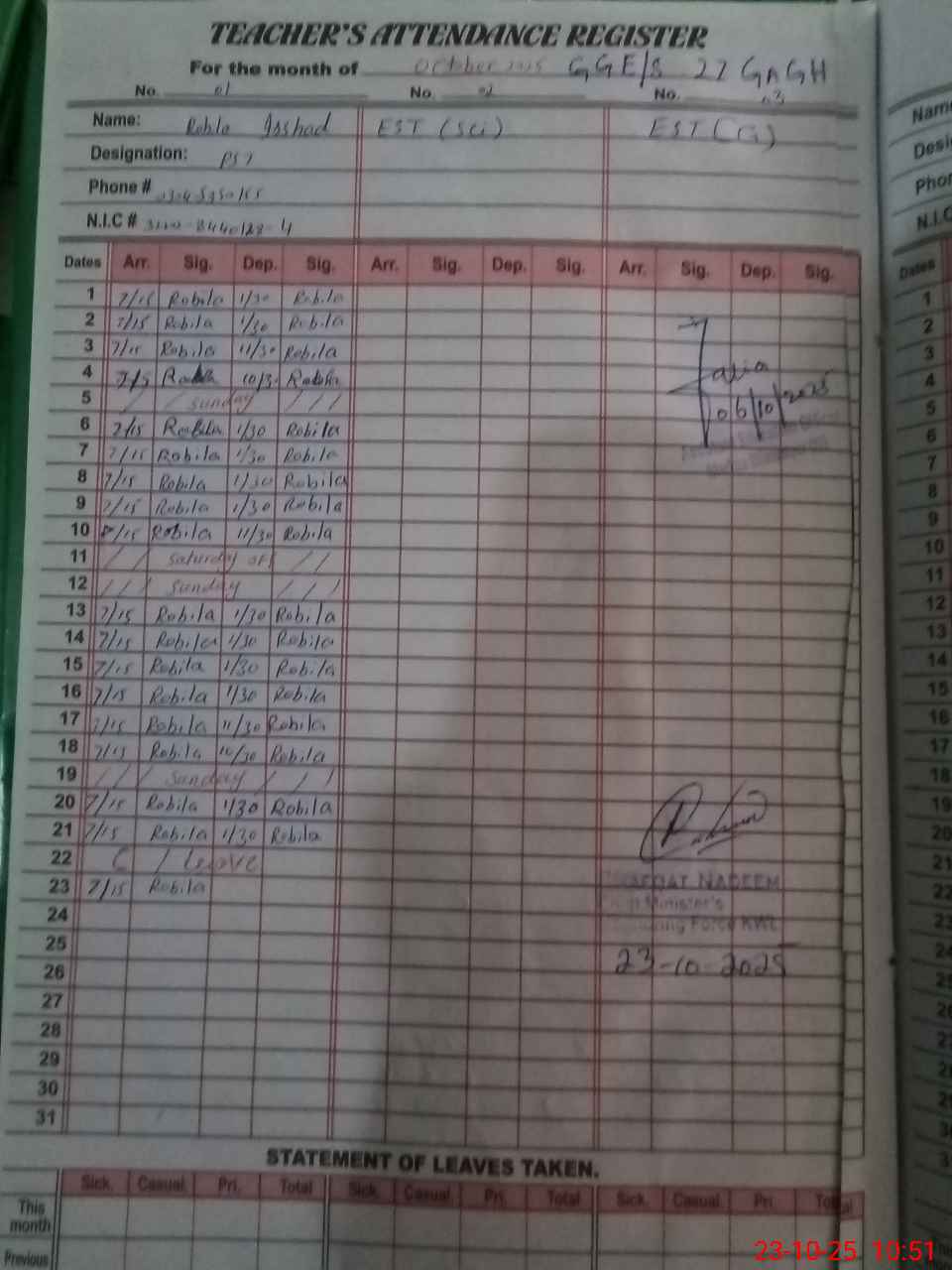 | CNIC | Full Name | Designation | R/C | Absence During Last Calender Month |
