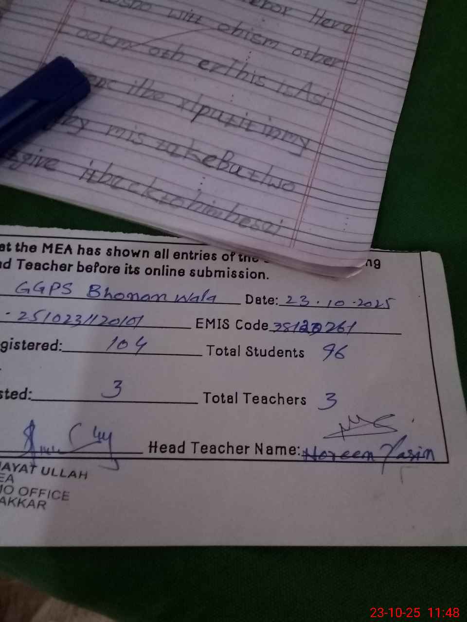 | Certified that this School was Inspected by the Undersigned MEA/DMO Today and the Information Stated Above is as Per Record. | |||||