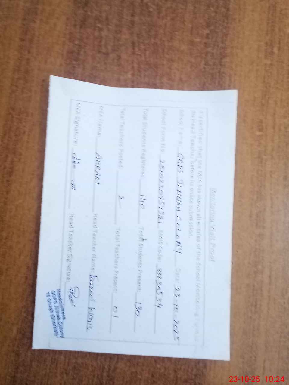 | Attendance Register | Head Teacher | MEA with School | Visit Proof |