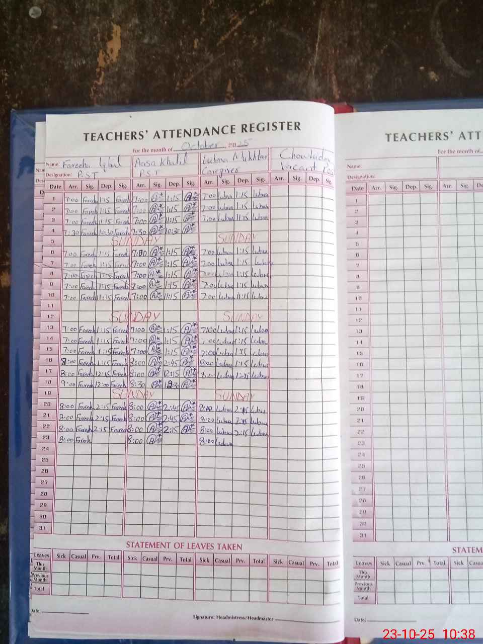| Leave | Duty | Absent | Maternity | Medical | Ex- Pak |