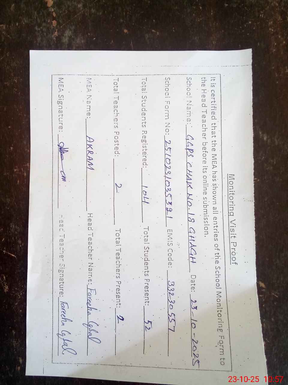| Attendance Register | Head Teacher | MEA with School | Visit Proof |