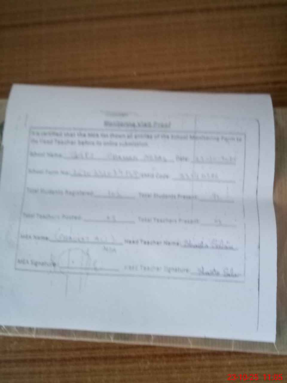 | Attendance Register | Head Teacher | MEA with School | Visit Proof |