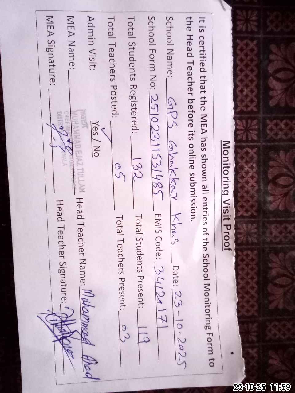 | Attendance Register | Head Teacher | MEA with School | Visit Proof |