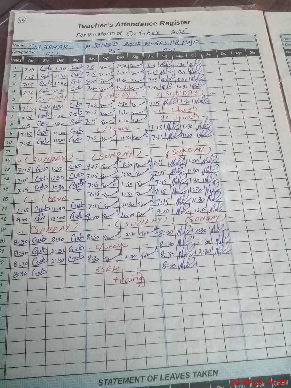 Leave Type | Remarks for today (Leave,Training, Exam,Absent,Late, Other duty) |