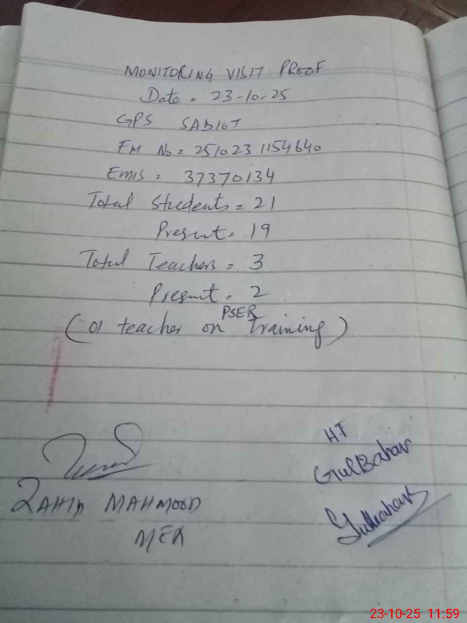 | Attendance Register | Head Teacher | MEA with School | Visit Proof |