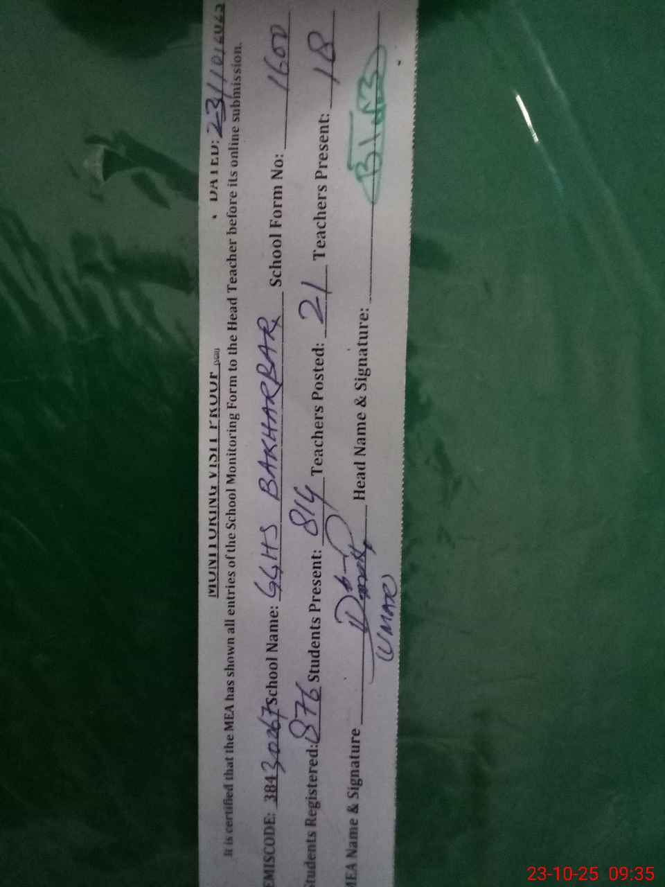 | Certified that this School was Inspected by the Undersigned MEA/DMO Today and the Information Stated Above is as Per Record. | |||||