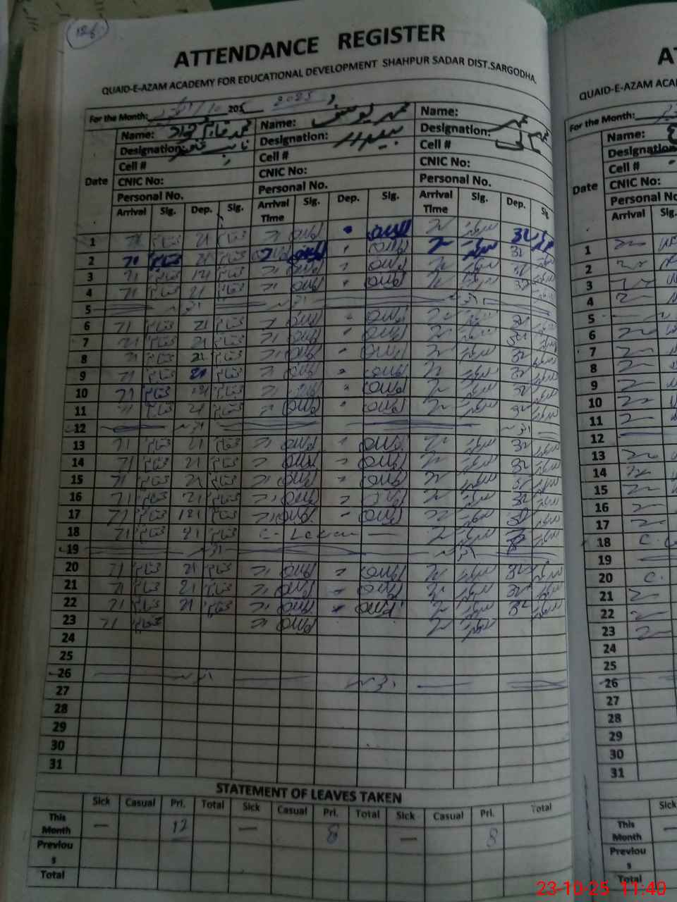 | CNIC | Full Name | Designation | R/C | Absence During Last Calender Month |