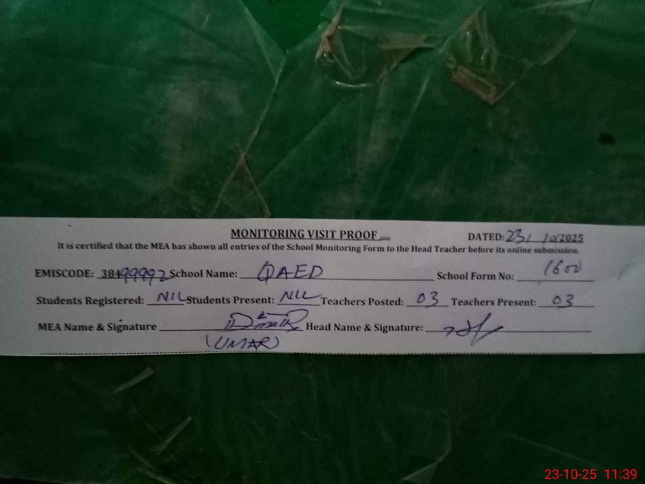 | Certified that this School was Inspected by the Undersigned MEA/DMO Today and the Information Stated Above is as Per Record. | |||||