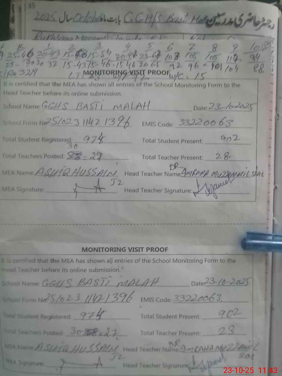 | Attendance Register | Head Teacher | MEA with School | Visit Proof |
