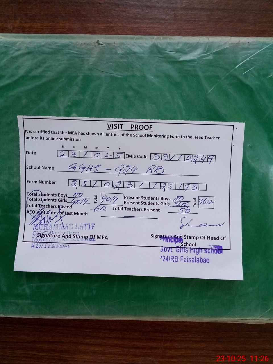 | EMIS Code: 33110249 | Name of School: GGHS CHAK NO 224 RB WAZIR KHAN | |||
