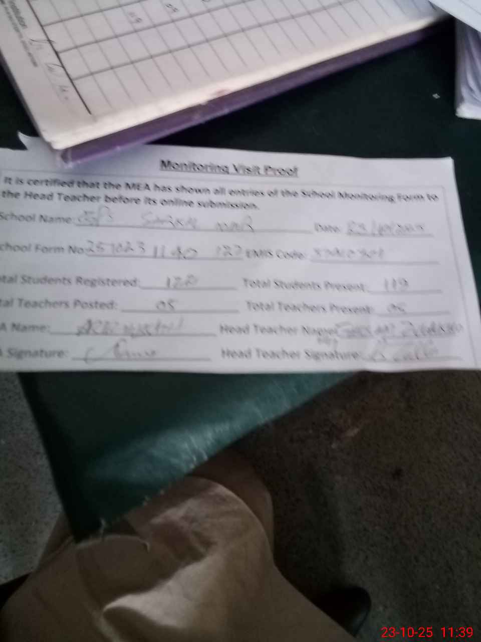 | Attendance Register | Head Teacher | MEA with School | Visit Proof |