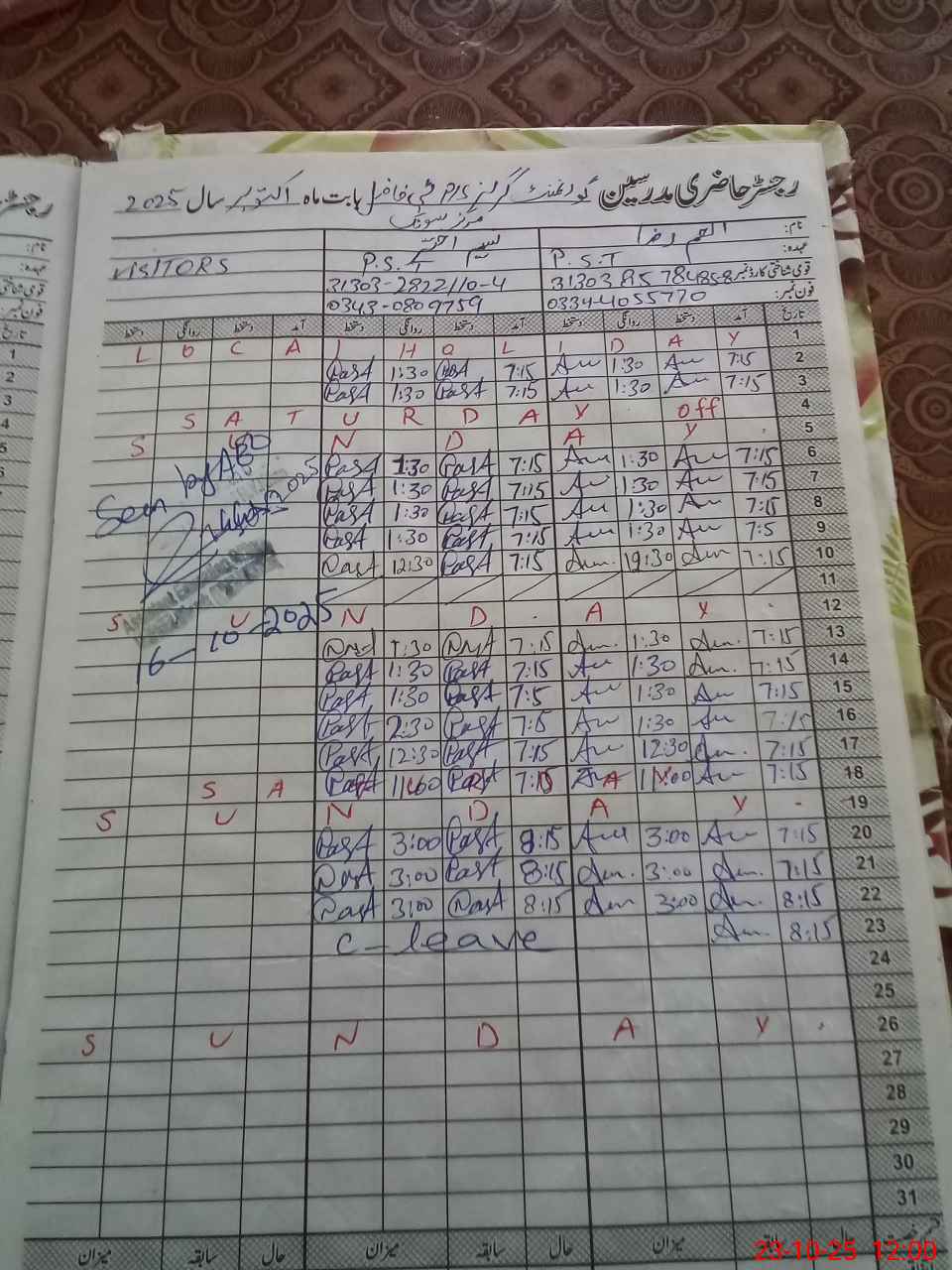 | CNIC | Full Name | Designation | R/C | Absence During Last Calender Month |