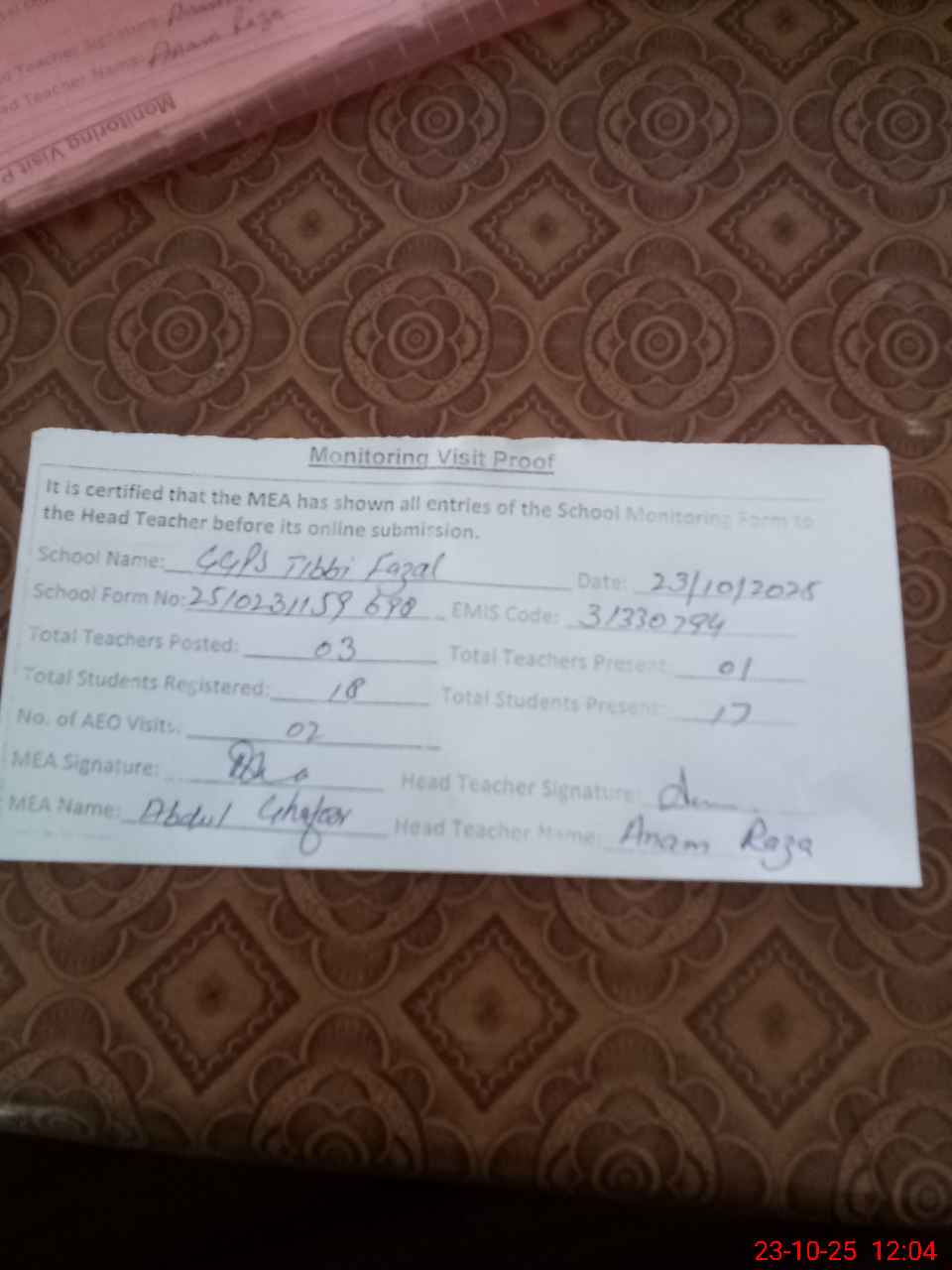 | Attendance Register | Head Teacher | MEA with School | Visit Proof |