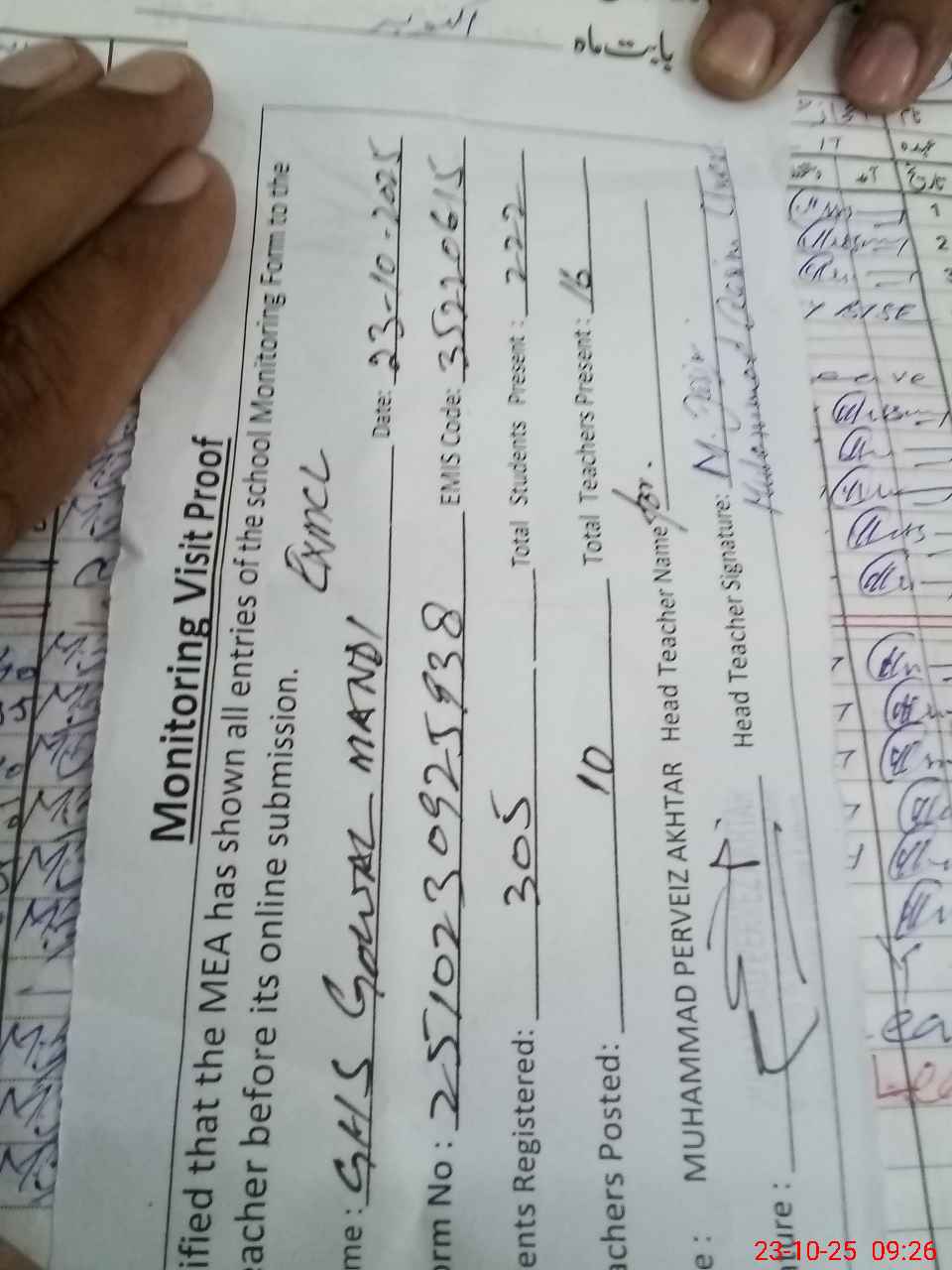 | Attendance Register | Head Teacher | MEA with School | Visit Proof |